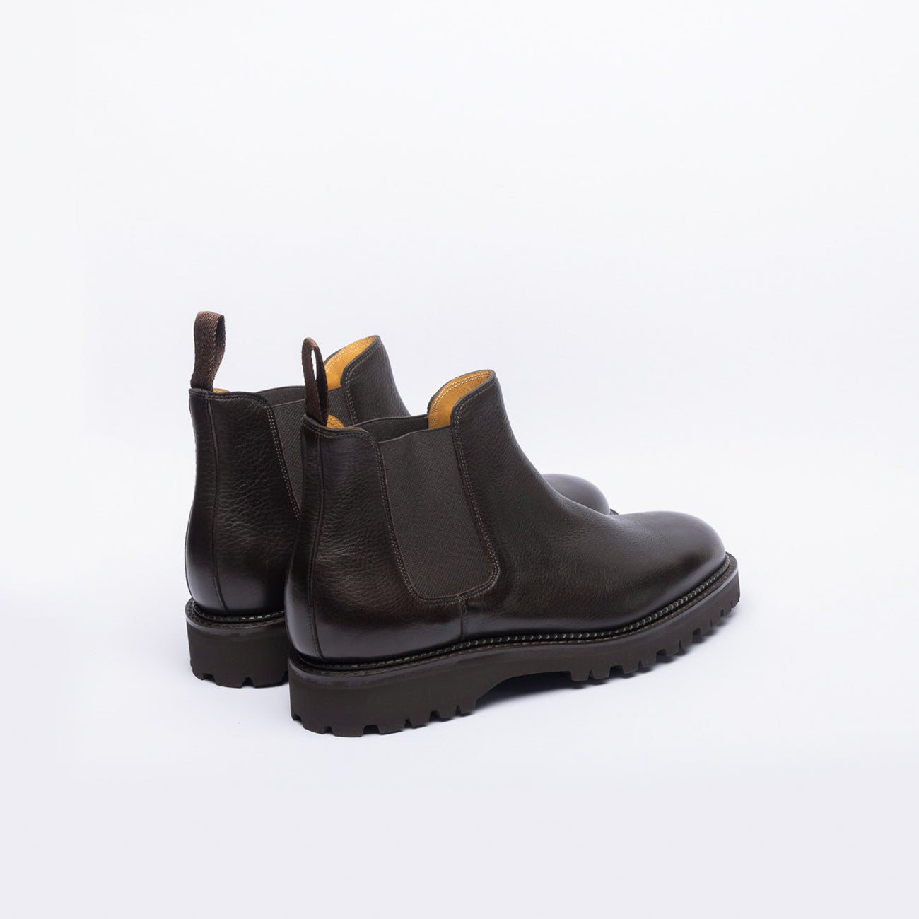 Stivale chelsea in pelle di vitello martellata marrone testa di moro (Dark brown gentle grain calf) fodera interna e soletta interna in pelle, intersuola in cuoio, costruzione Goodyear, suola marrone in gomma commando Hilly rubber sole di John Lobb.