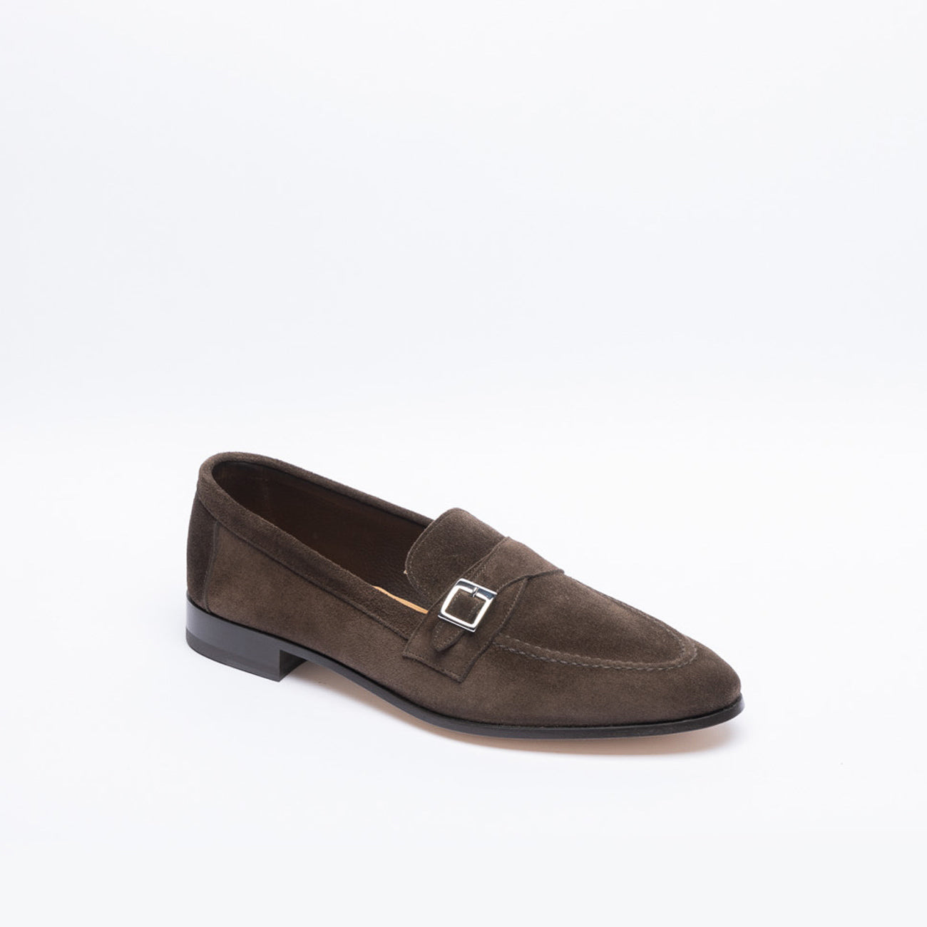 Unlined soft brown suede (Tobacco velours) penny loafer, with lightweight leather sole and non-slip rubber central insert. Made in Italy.