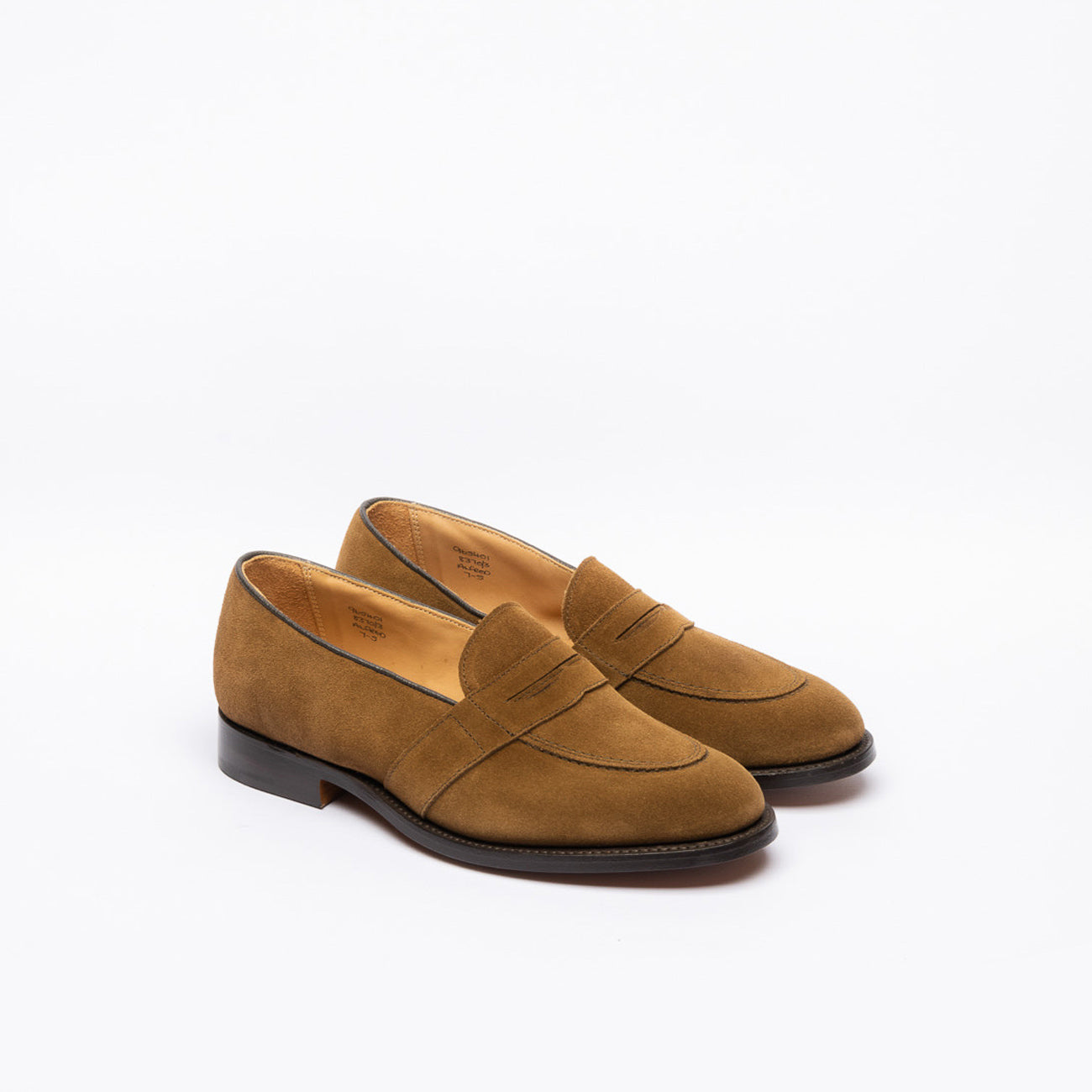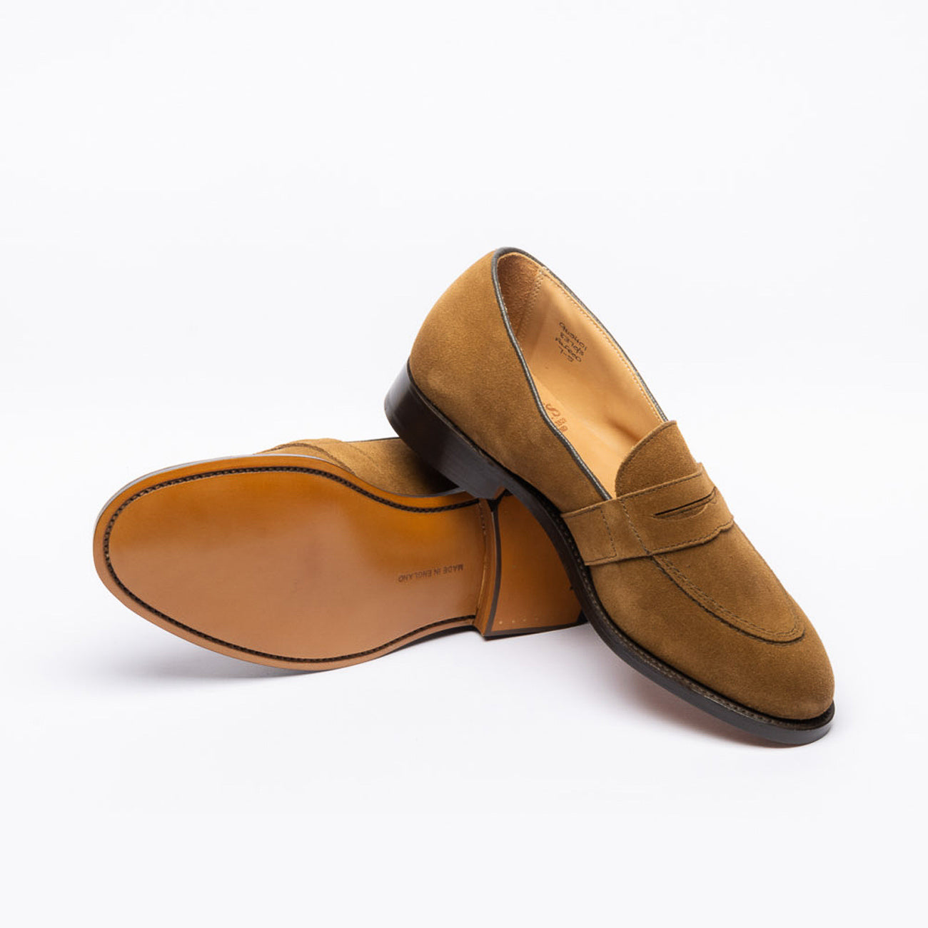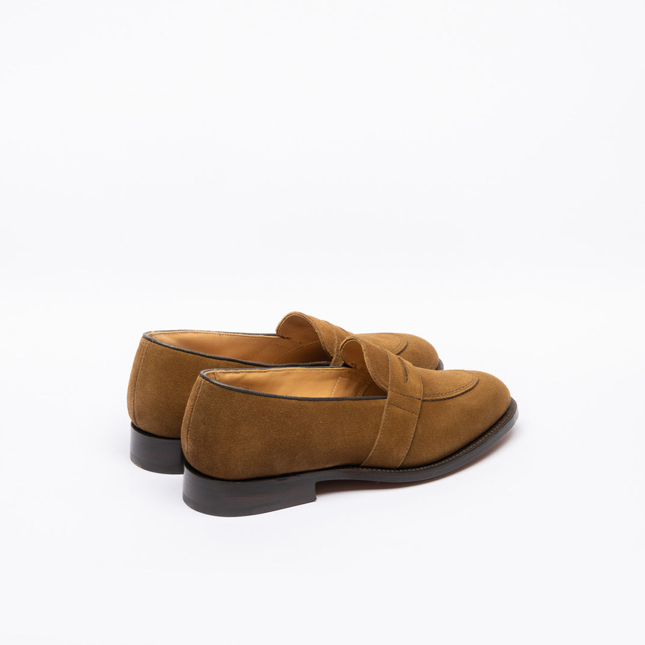 Mocassino penny in camoscio marrone chiaro (Cubana opera suede), fodera interna e soletta interna in pelle, Lavorazione Goodyear e guardolo anti pioggia, suola in mono fondo cuoio.