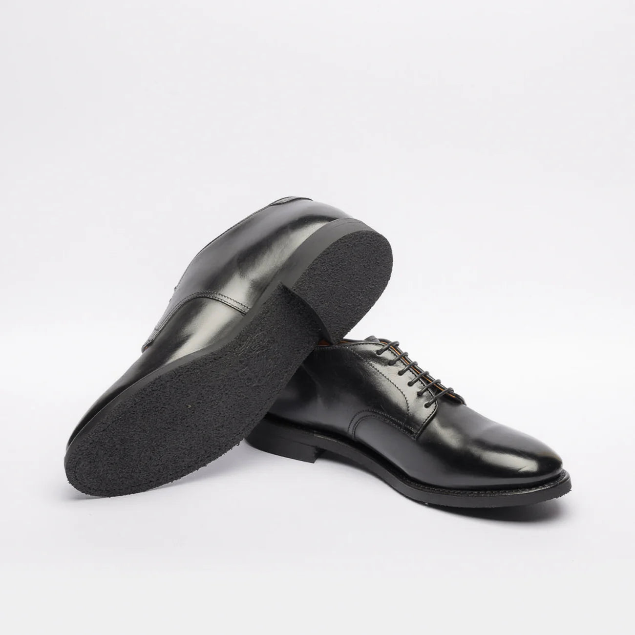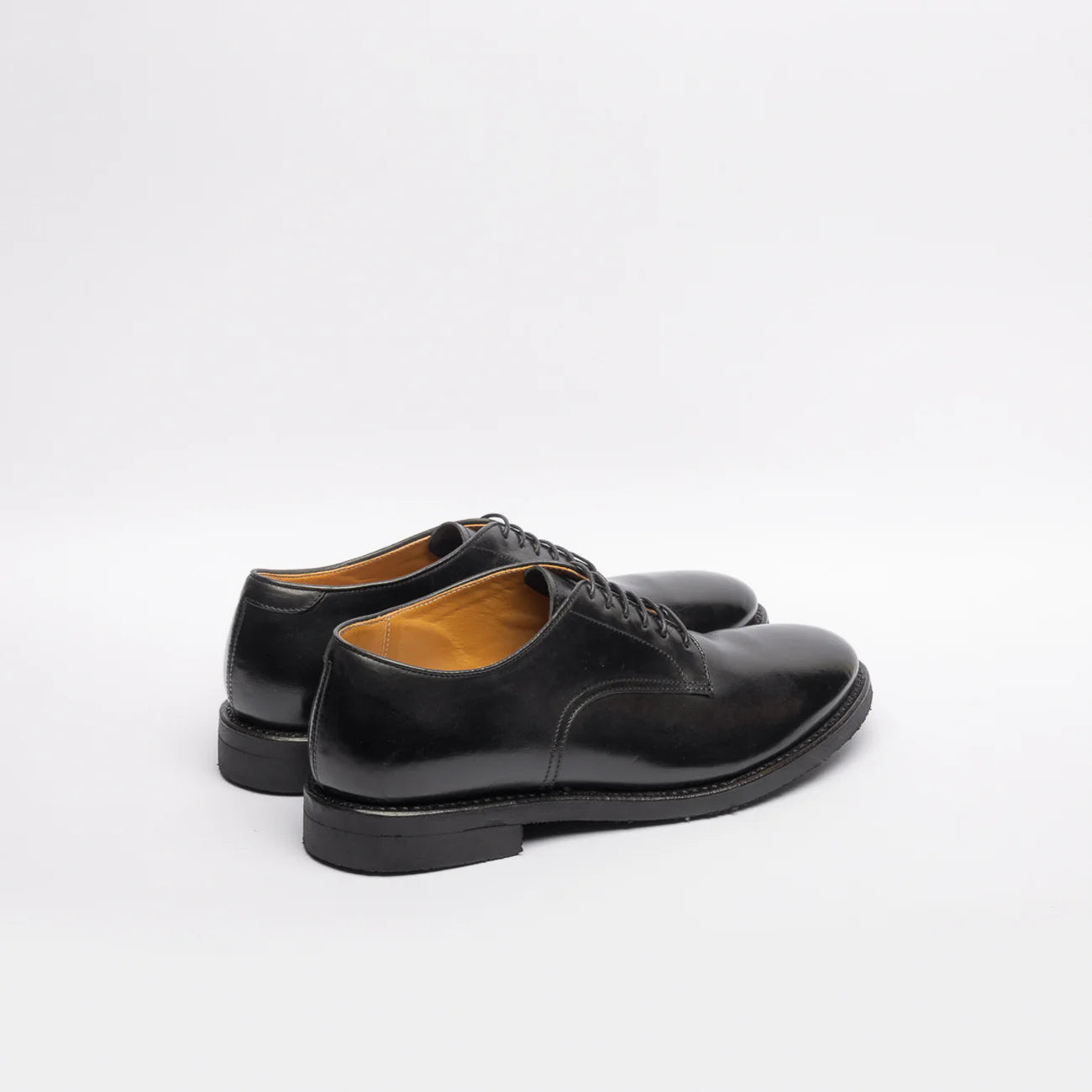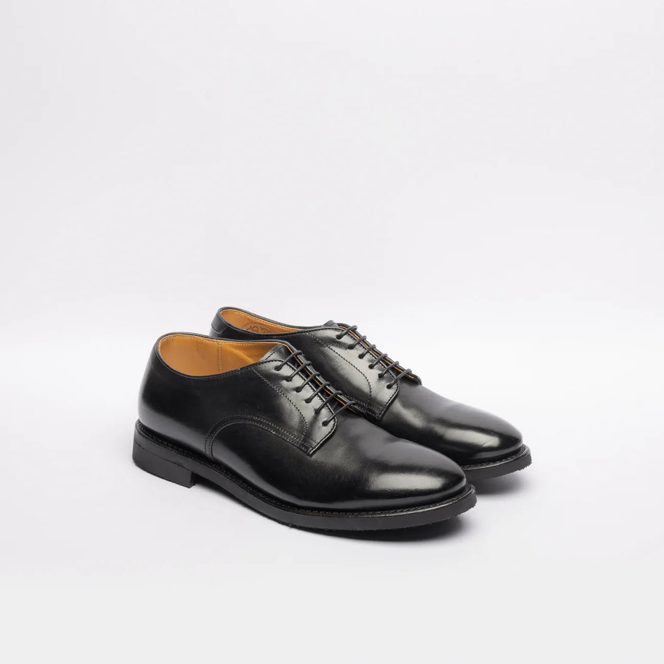 Stringata derby a cinque occhielli in pelle di vitello nera, fodera interna e soletta interna in pelle, costruzione Blake rapid, fondo in gomma flessibile.