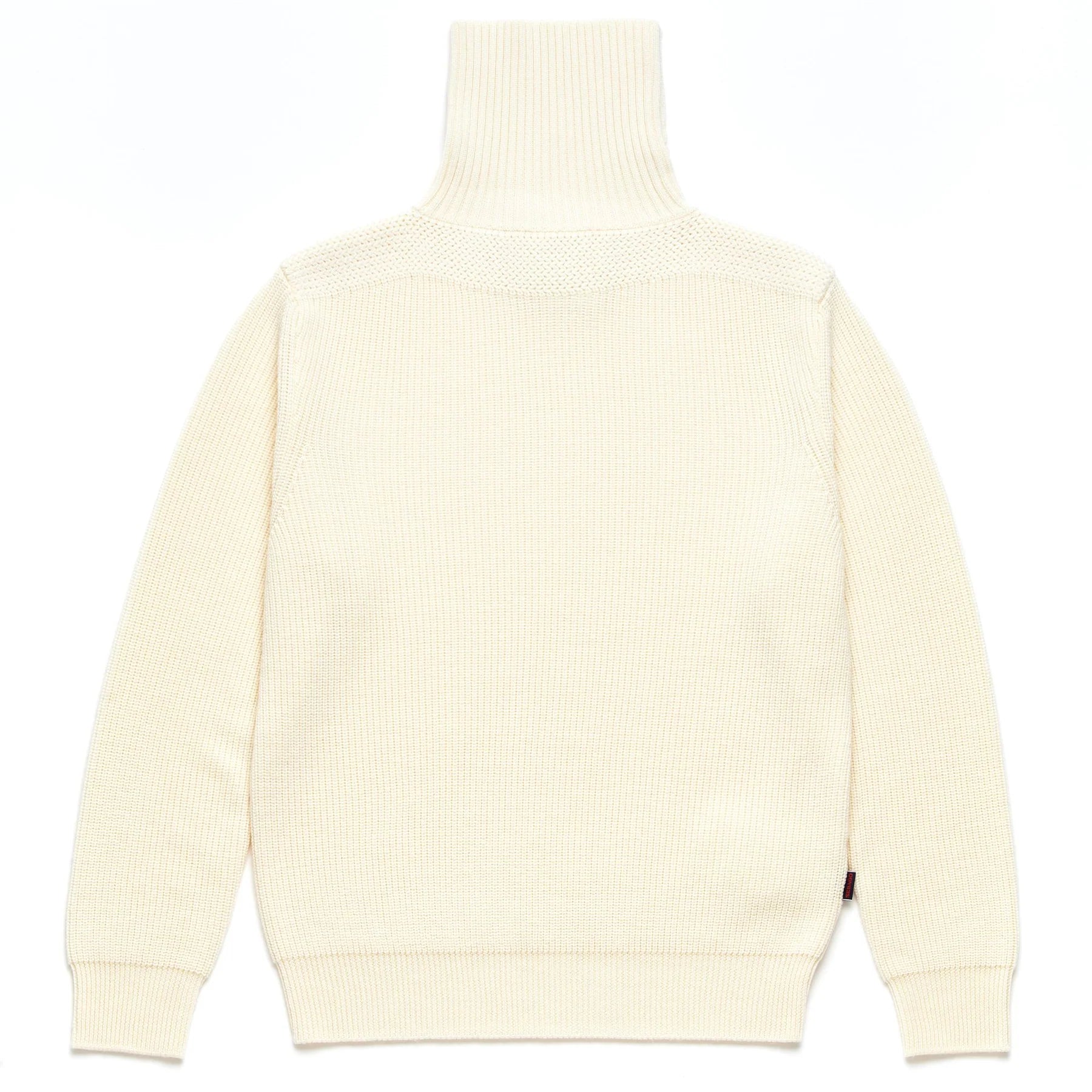 Soft white Merino wool winter turtleneck sweater with ribbed collar and cuffs, English rib stitch shoulders, regular fit.