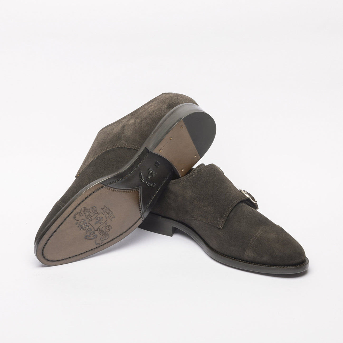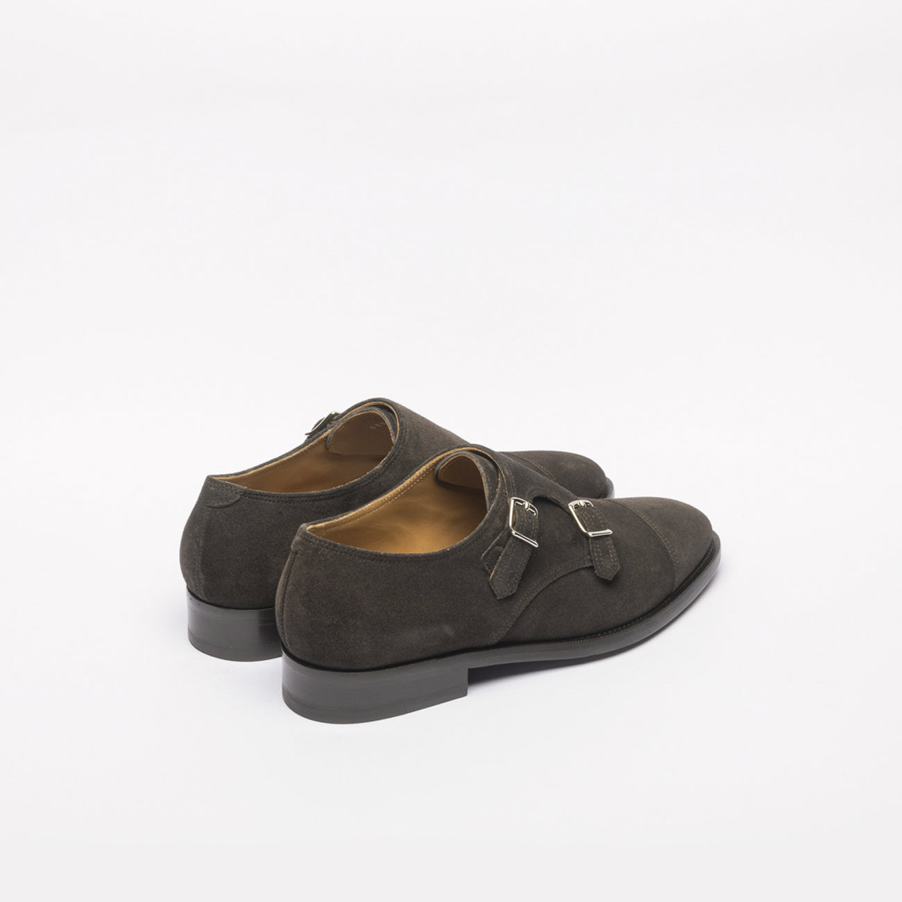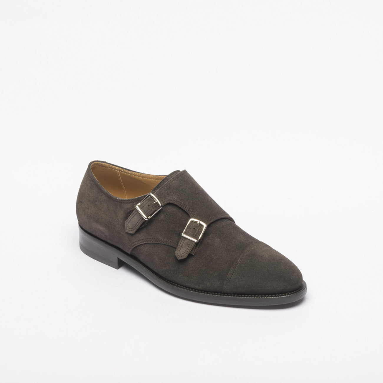 Doppia fibbia in pelle di vitello marrone, puntale cucito, fodera e soletta in pelle, intersuola in cuoio, mono fondo in cuoio.