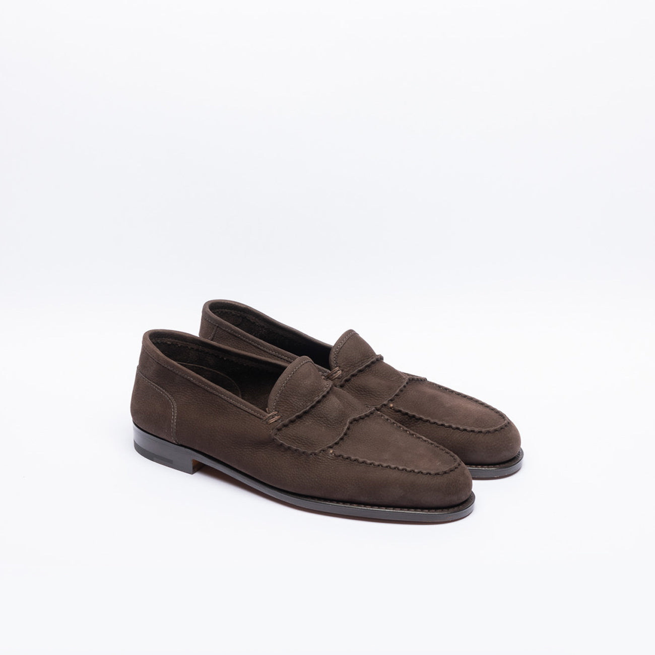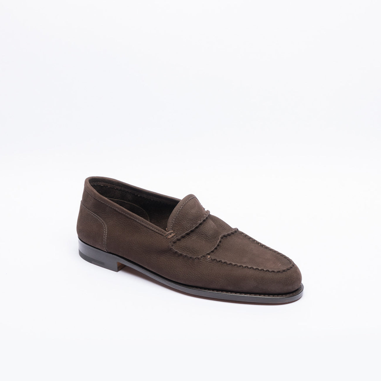 Mocassino penny sfoderato in morbida pelle nabuk martellata marrone, mascherina cucita a mano sulla tomaia, soletta interna in pelle, costruzione Goodyear, suola flessibile in mono fondo cuoio.