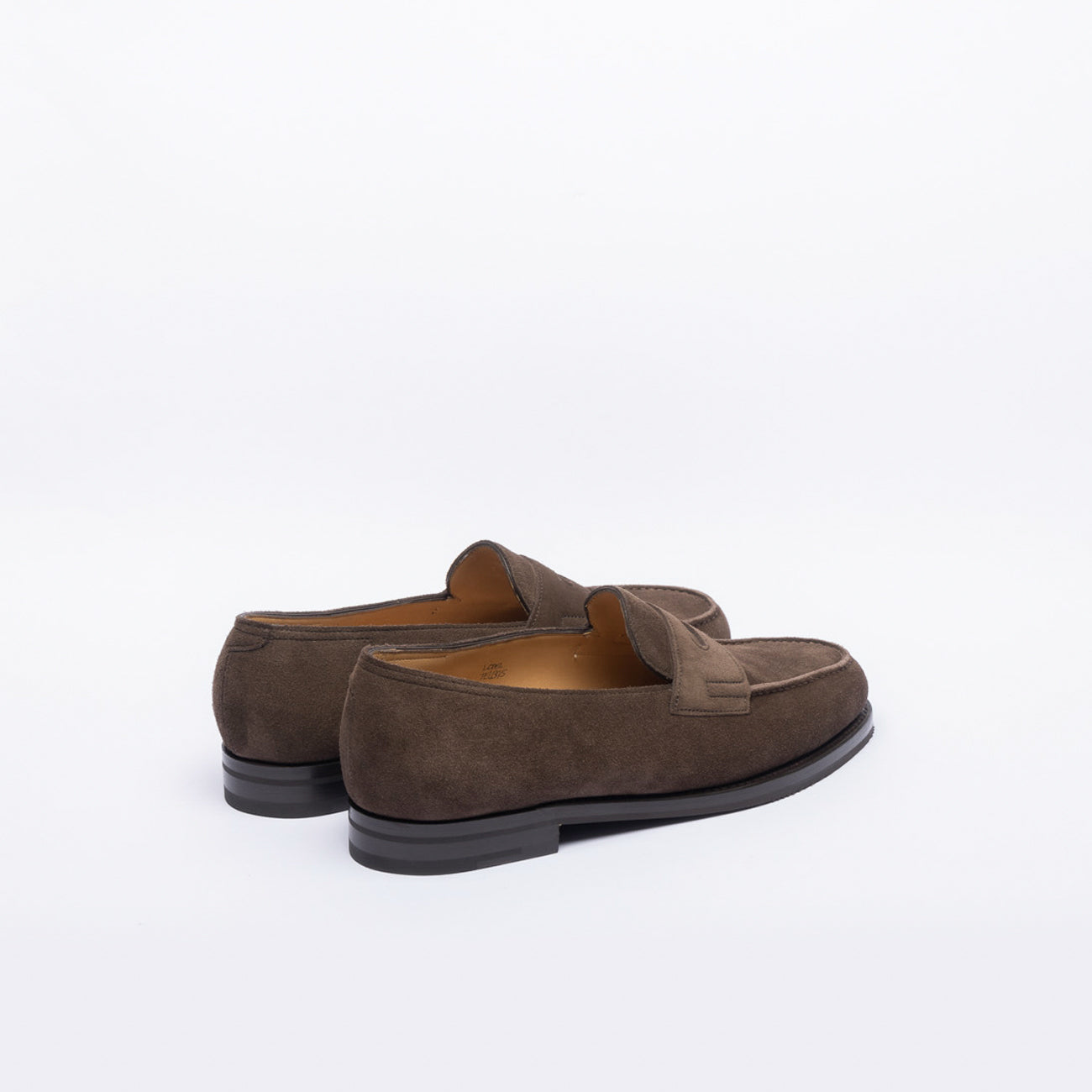 Mocassino penny in morbida pelle scamosciata marrone, (Bruinn suede), fodera intera e soletta interna in pelle, costruzione Goodyear, intersuola in cuoio e suola in leggera gomma Flexi Rasp sole di John Lobb.