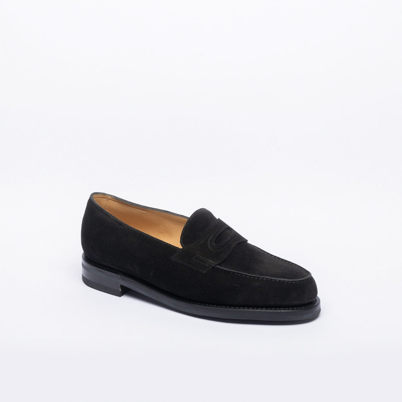 Mocassino penny in morbida pelle scamosciata nera, fodera intera e soletta interna in pelle, costruzione Goodyear, intersuola in cuoio e suola in leggera gomma Rasp sole di John Lobb.