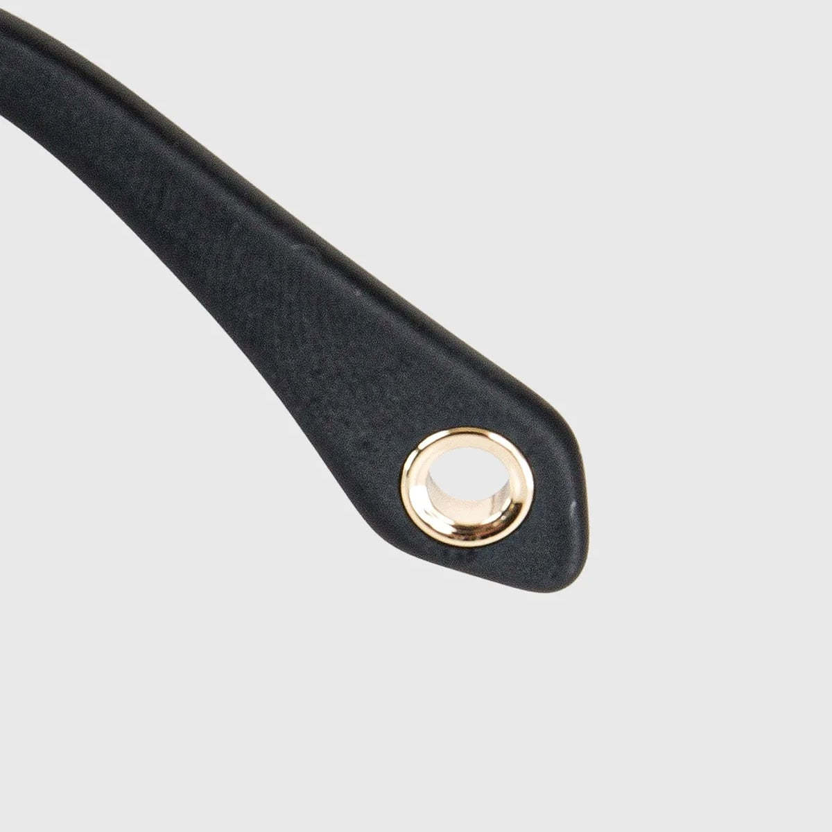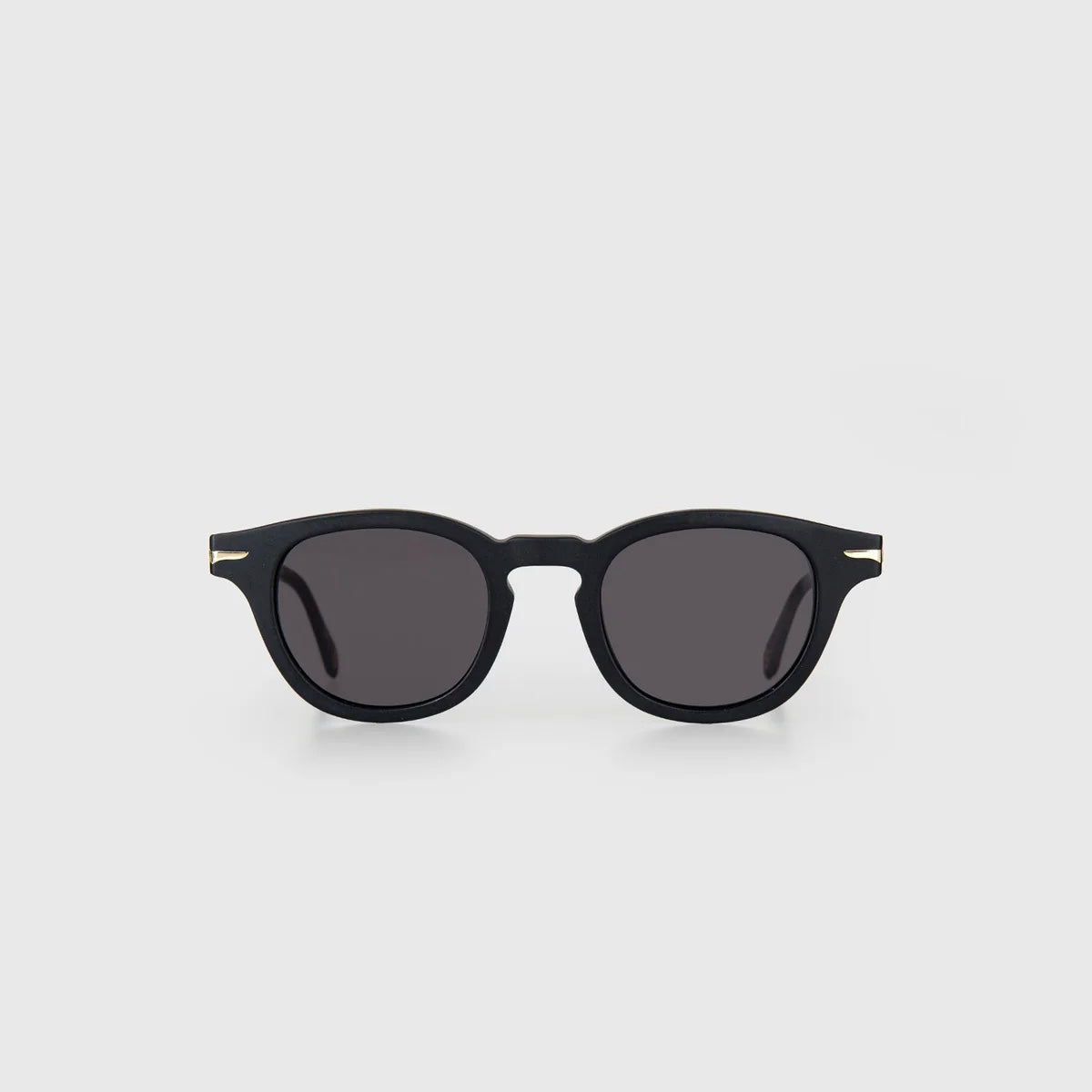 Occhiali da sole unisex in acetato opaco nero, forma rotonda con ponte nasale, dettagli metallici laterali, aste a chiusura 45° con occhiello forato in metallo.