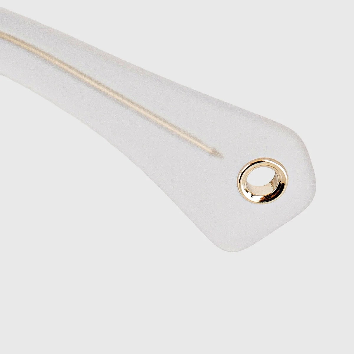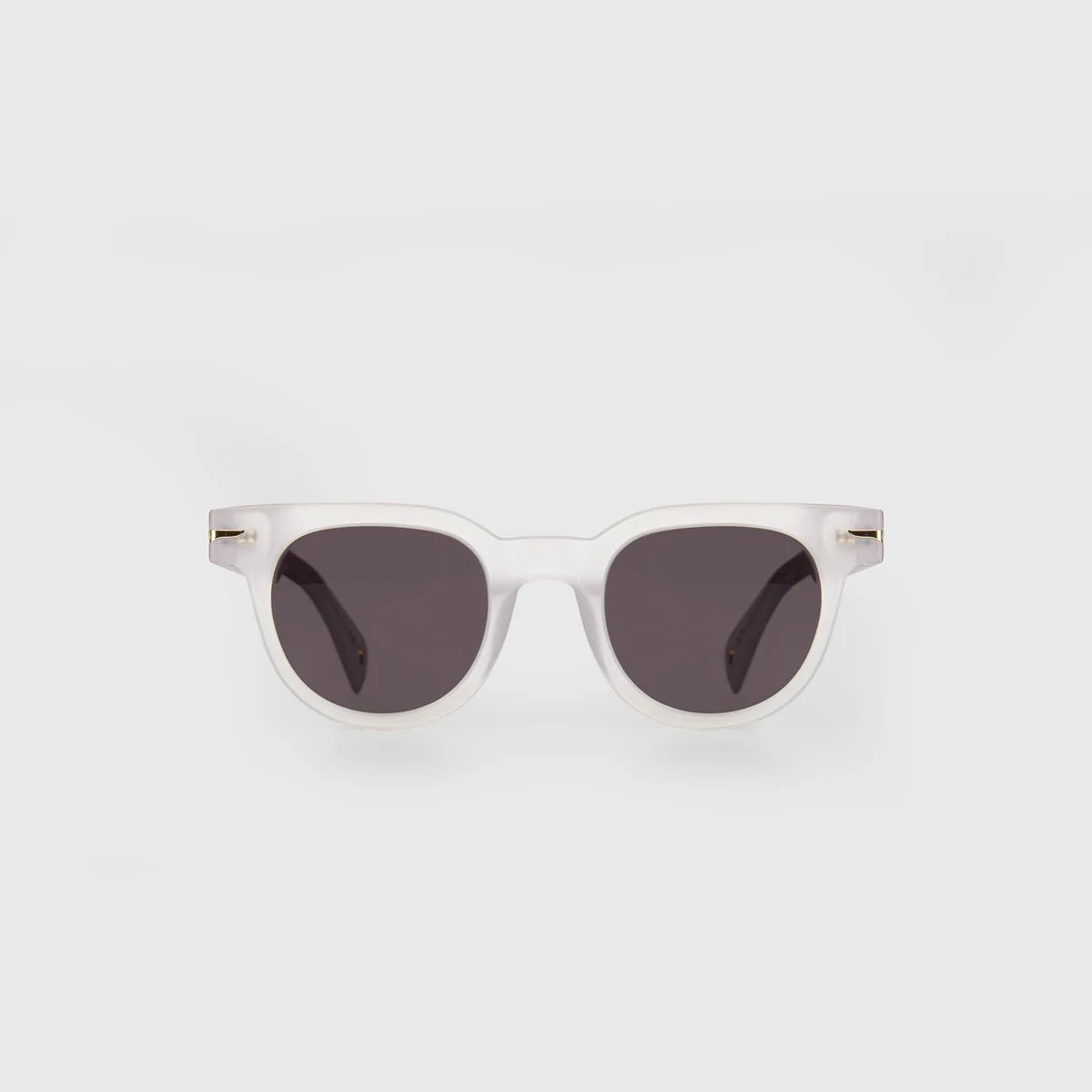 Occhiali da sole unisex in acetato opaco bianco trasparente, forma squadrata con ponte nasale, dettagli metallici laterali, aste a chiusura 45° con occhiello forato in metallo.