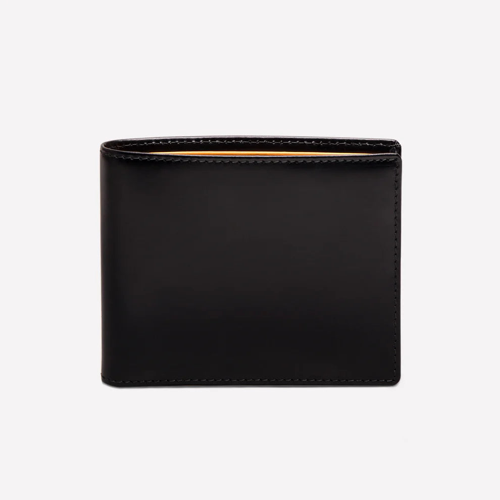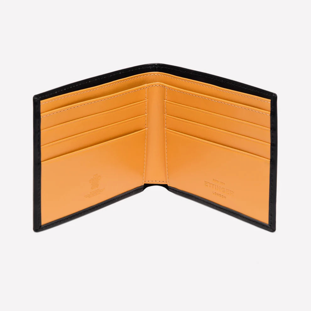 Portafoglio in resistente pelle "Bridle leather" nera (pelle tipicamente utilizzata per realizzare selle e briglie da equitazione) con interni in pelle conciata al vegetale gialla londinese, sei scomparti portacarte, ampia apertura centrale porta banconote e doppia tasca laterale interna, fodere interne in tessuto Jacquard.