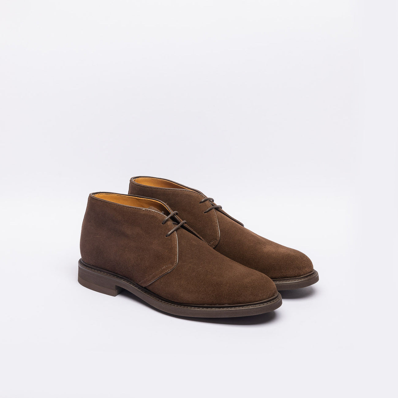 Polacco chukka a due occhielli in camoscio marrone testa di moro, fodera interna e soletta interna in pelle, intersuola in cuoio, guardolo antipioggia, costruzione Goodyear, suola nera in gomma Vibram.