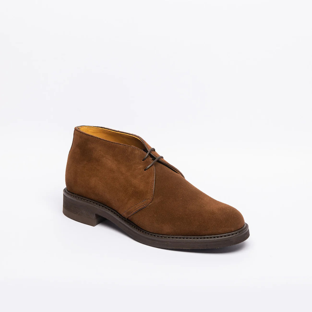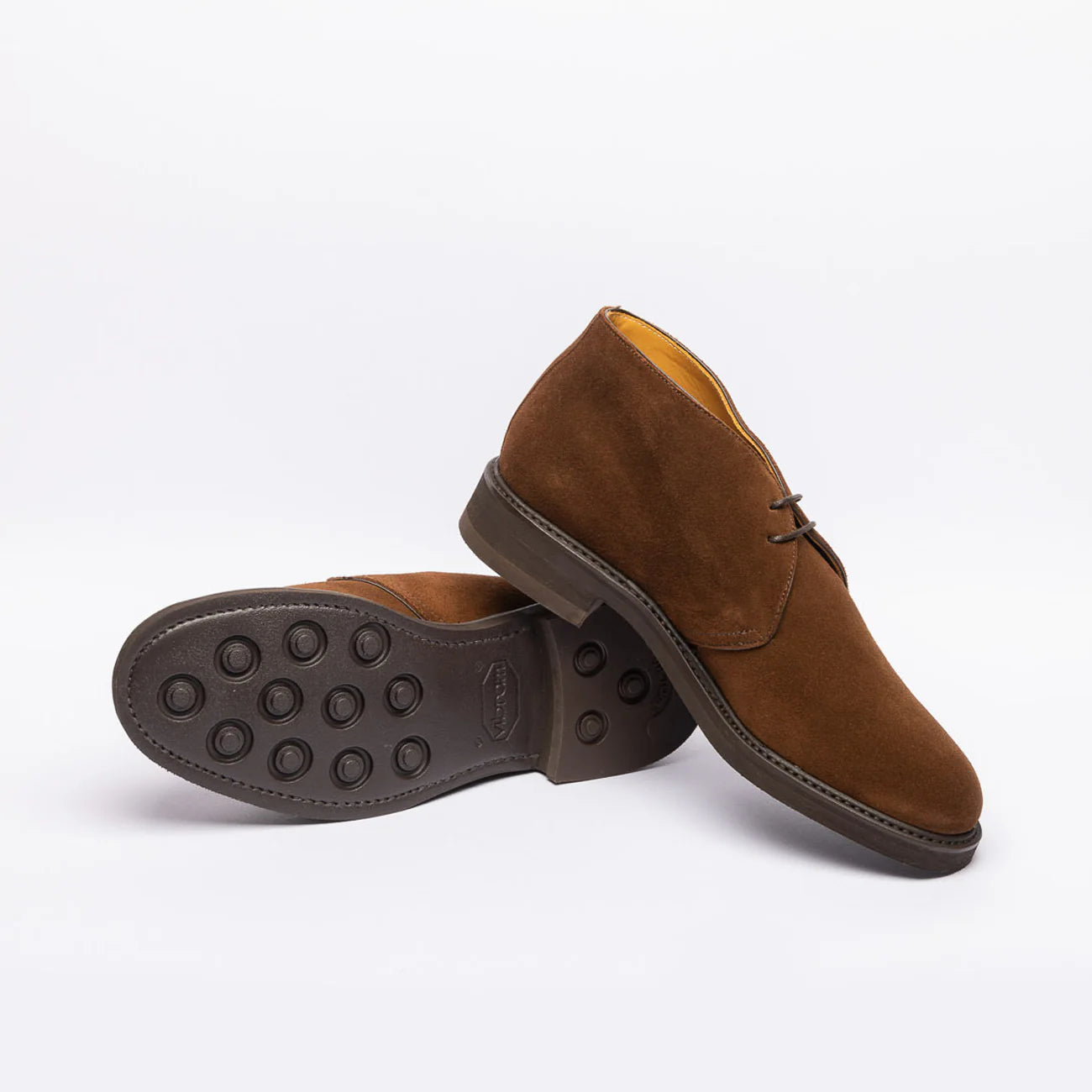Polacco chukka a due occhielli in camoscio marrone, fodera interna e soletta interna in pelle, intersuola in cuoio, guardolo antipioggia, costruzione Goodyear, suola nera in gomma Vibram.